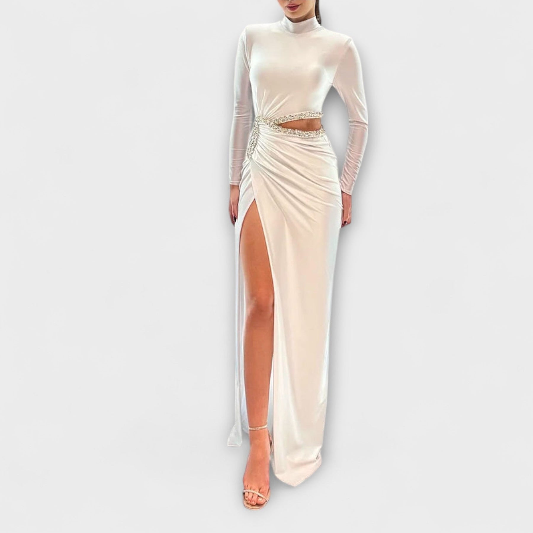 Selah - White Long Sleeve Dress with Waist Cutout and Rhinestone Accents
